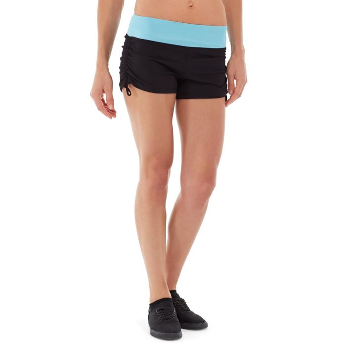 • Black rouched shorts with mint waist.